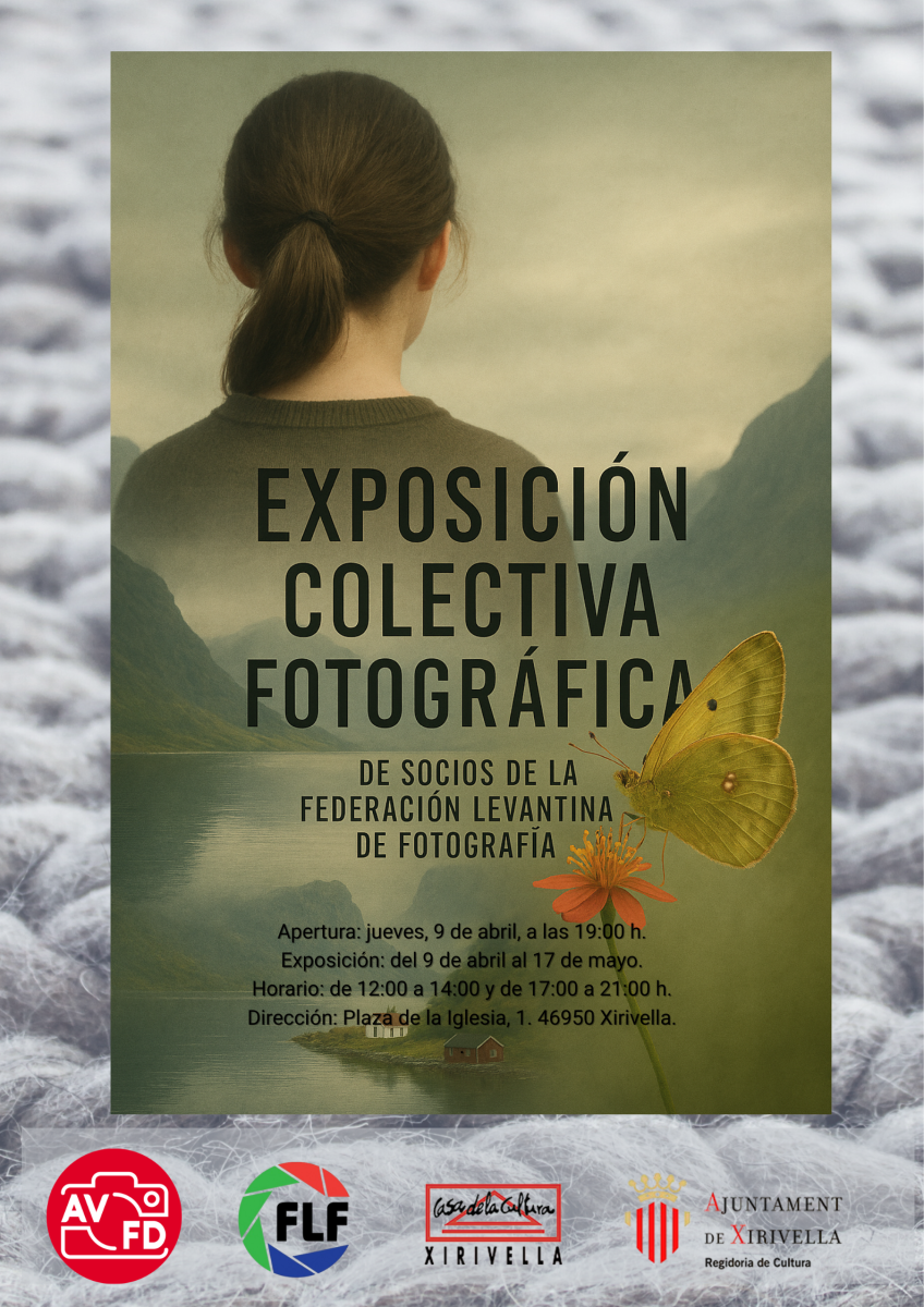 El próximo 9 de abril a las 19:00 se inaugura en la Casa de la Cultura de Xirivella (C/ Iglesia, 1) la exposición colectiva de socios y socias de la Federación Levantina de Fotografía, compuesta de las fotografías que representan a los dos mejores clasificados por Asociación de la pasada Liga 24/25. La exposición se podrá visitar hasta el 17de mayo en horario de 12:00-14:00 y 17:00-21:00.