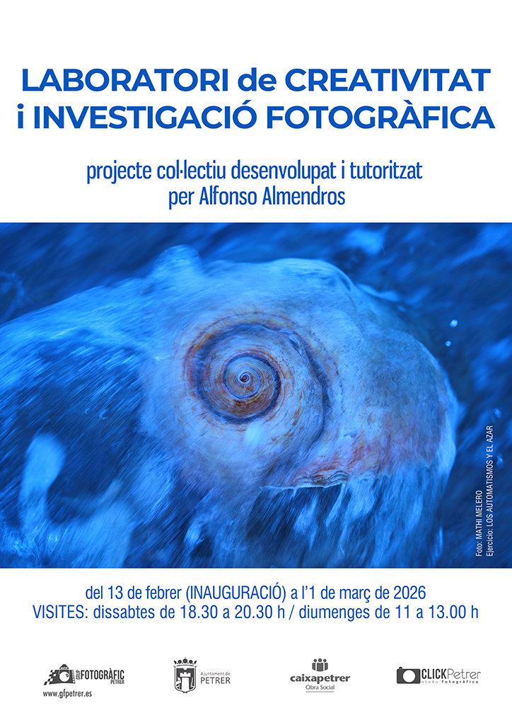 - Una exposición fotográfica en la sala Juan Miguel Martínez Lorenzo, compuesta por 69 imágenes del Laboratori de Creativitat i Investigació Fotogràfica - edició 2025, y que se podrá visitar del viernes 13 de febrero al domingo 1 de marzo, los sábados de 18:30 a 20:30 h. y los domingos de 11 a 13 h.