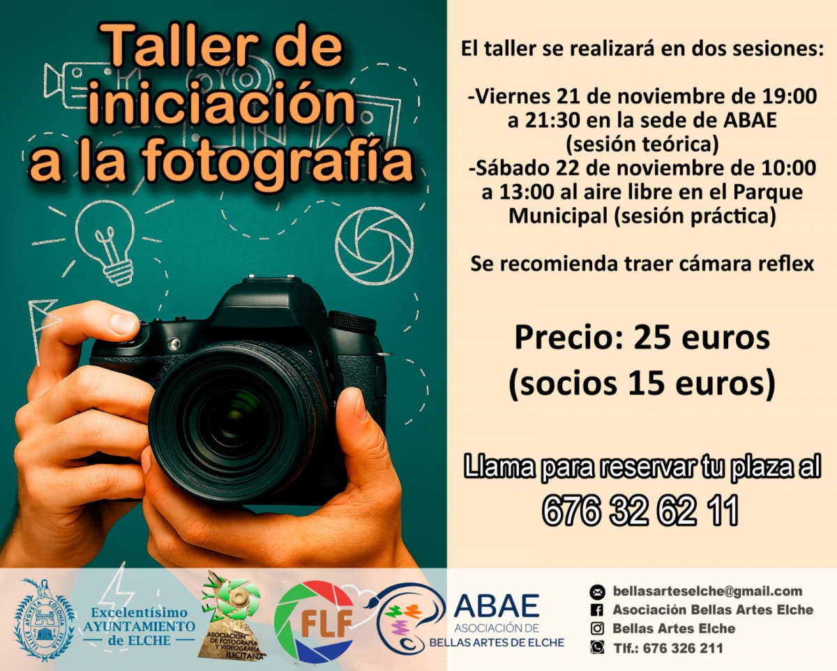 AFYVI (Asociación de Fotografía y Videografía Ilicitana) Anuncia su próximo taller de iniciación a la fotografía que comenzará este próximo Viernes 21 de noviembre de 19:00 a 21:30 en la sede de ABAE y terminará con una sesión práctica al día siguiente de 10:00 a 13:00 en el Parque Municipal. Para reservar plaza, ponerse en contacto a traves del teléfono 676 32 62 11